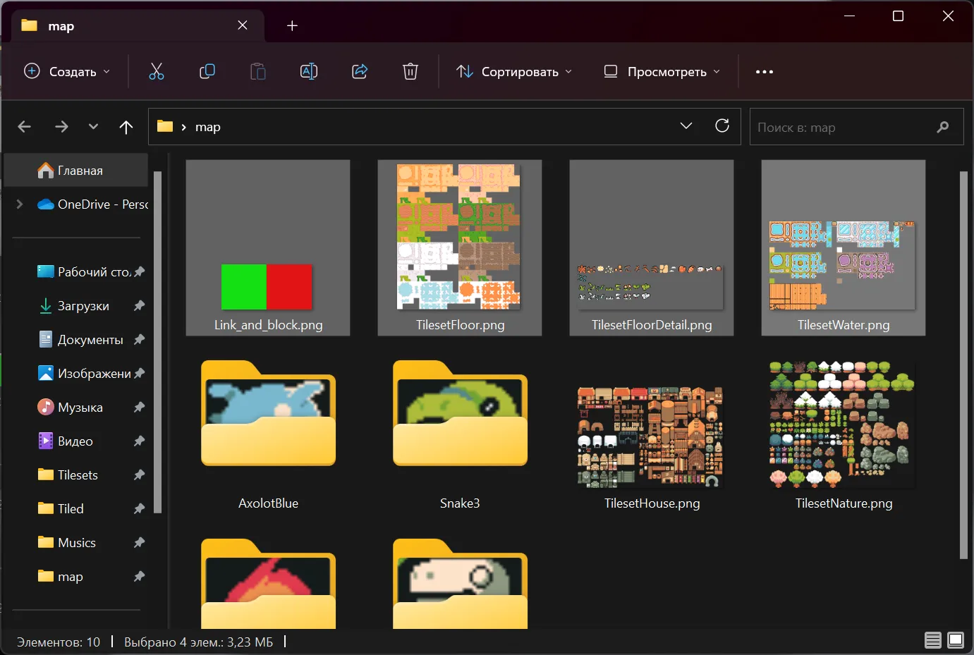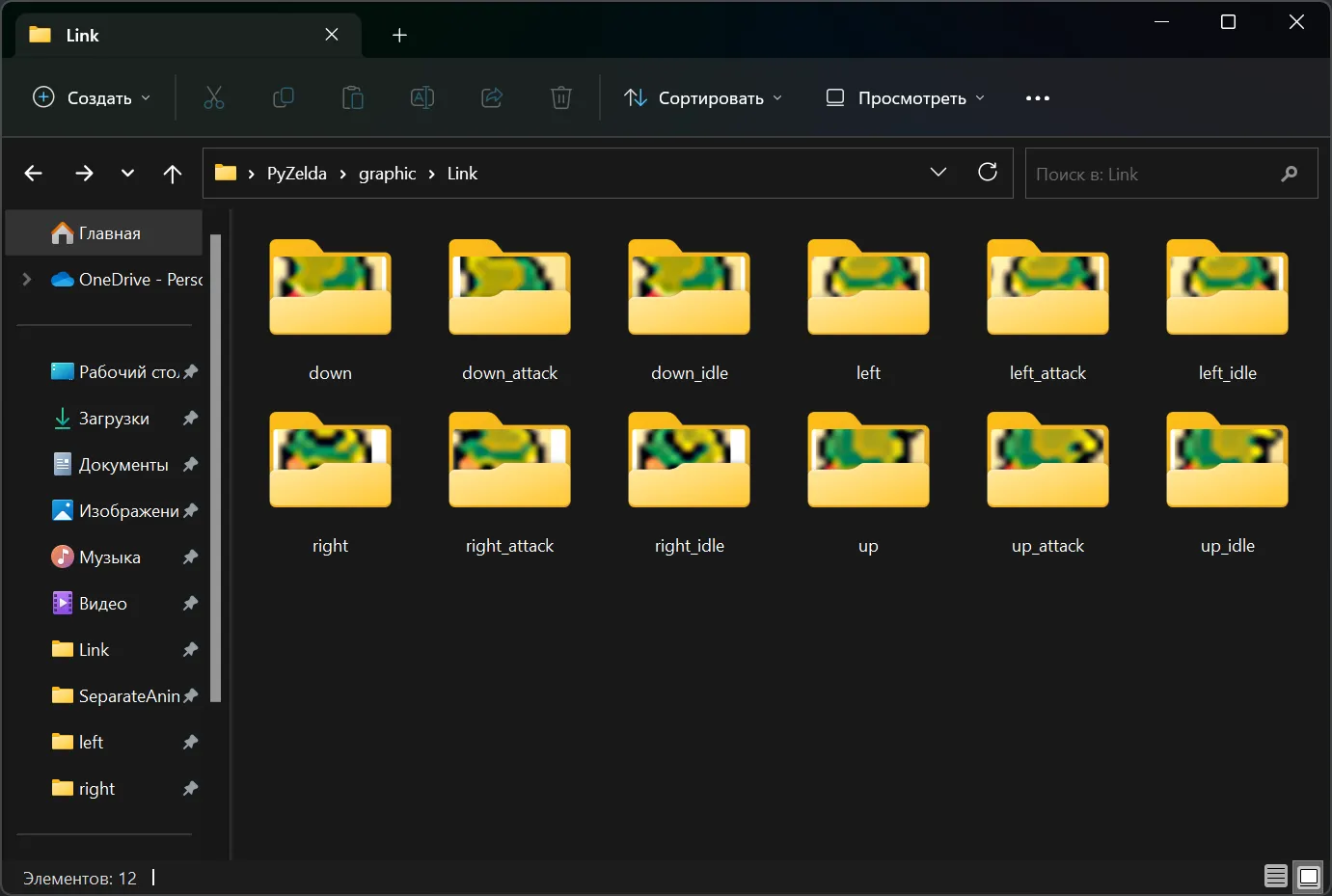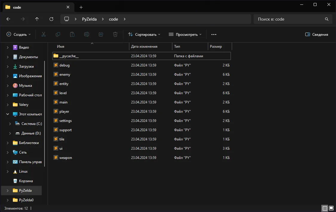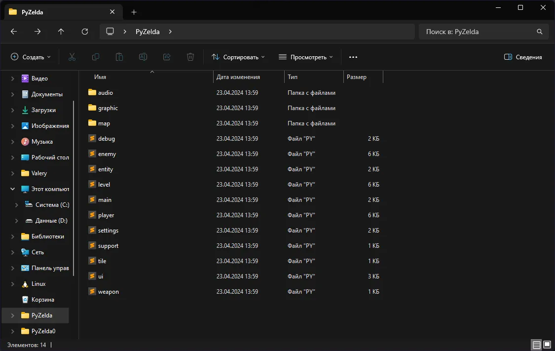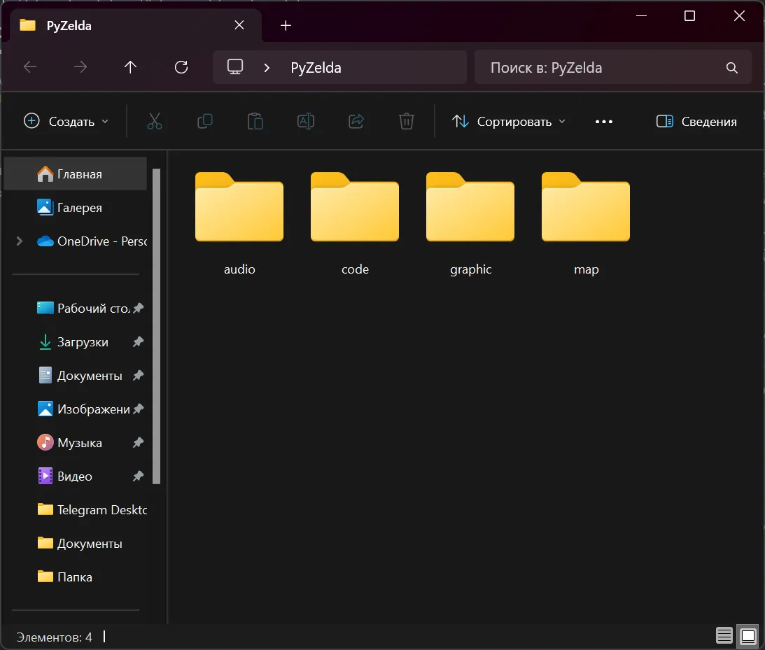 Для начала, давайте создадим папку проекта. Я назвал проект PyZelda и в папке проекта есть ещё 4 директории: audio, code, graphic и map.