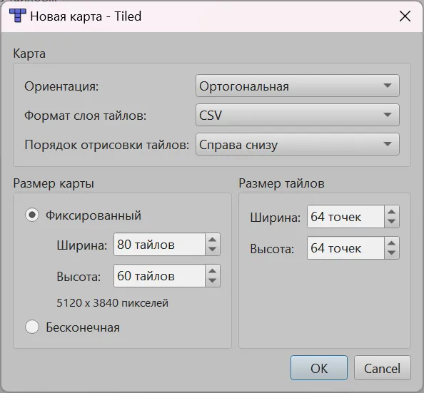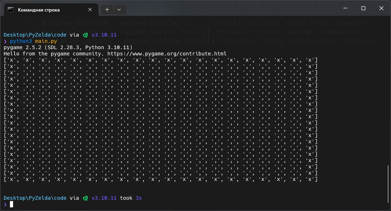 В settings.py будут все настройки игры. Стандартные ширина и высота окна, а также число FPS (частота обновления окна) и самая интересная часть — размер тайла. Как я говорил ранее, тайл — это квадрат текстуры и именно данный квадрат мы описываем размерами. Высота и ширина кадра измеряется в пикселях (я установил 1280 на 720), как и сам тайл, но есть важный момент — тайл всегда квадратный. Поэтому, мы прописываем размер квадрата тайла (он у нас 64 на 64 пикселя). Далее, мы создаём карту мира. Сейчас она 20 на 20 тайлов (далее, в проекте будем рисовать всё тайлами). Я обозначил, что 'x' — это конец карты, а ',' — пустое место для игры.