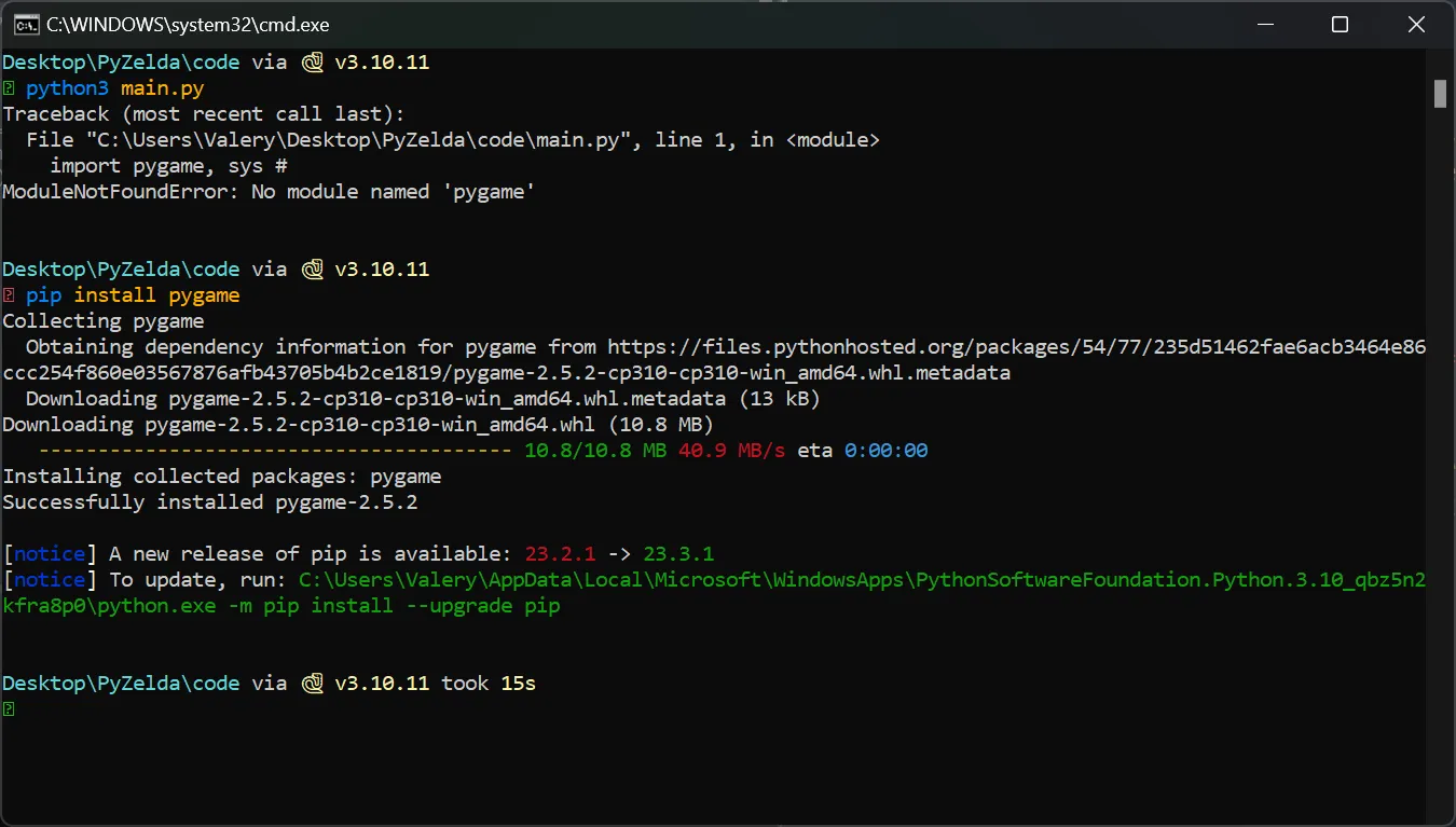 - Нужно скачать все библиотеки. Так как мы использовали только pygame, то её нам и нужно скачать. Для питониста — ничего сложного, а вот для геймера — трудность и шанс скинуть игру в ту, которую он не будет смотреть.