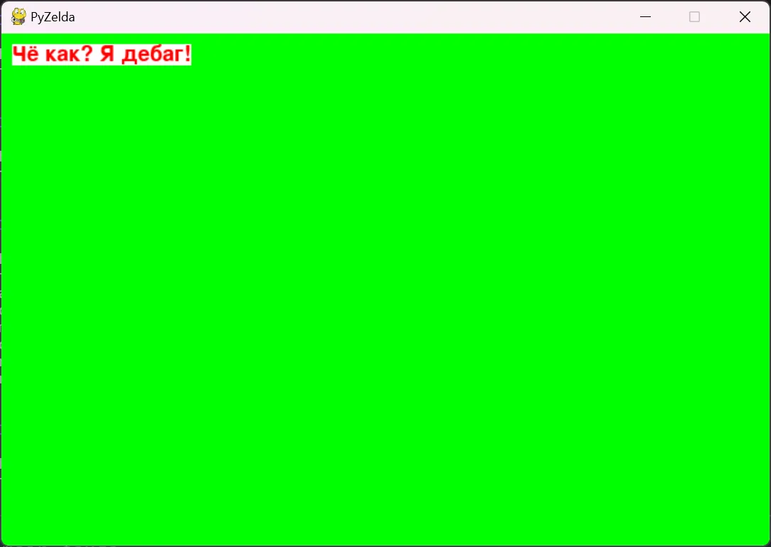 В данном файле мы создадим дебаг игры. Это поле, которое мы выводим вверху слева экрана и в нём показываем нужный нам текст. Для запуска дебага, нужно импортировать debug в main-файл и вывести что-то после отрисовки окна. Примерно так (файл main.py):