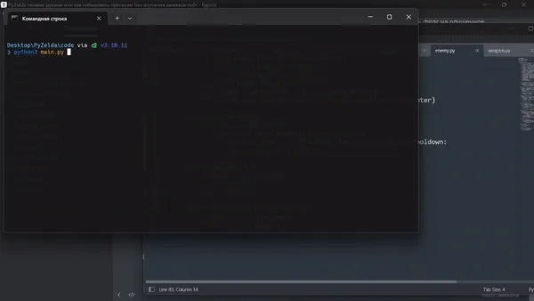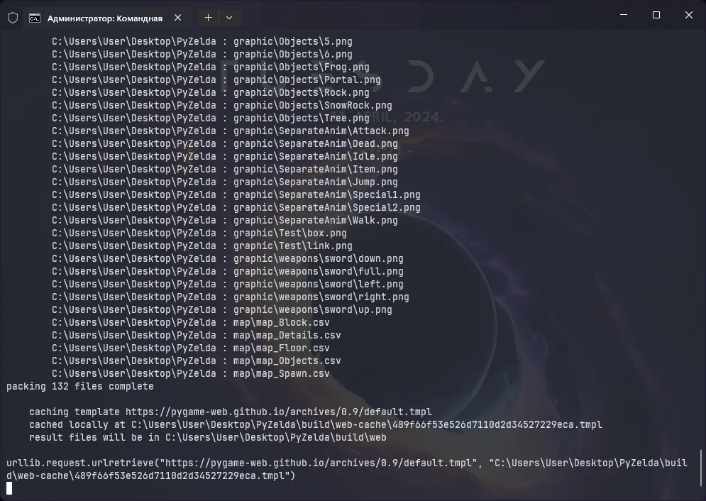 Теперь в командной строке (или терминале) переходим на директорию выше и запускаем pygbag директории (в моём случае, это “PyZelda”). Таким образом, из директории мы делаем хостинг сервер, который в процессе инициализации будет собирать все потоки в псевдобиты и кешировать всё, что возможно.