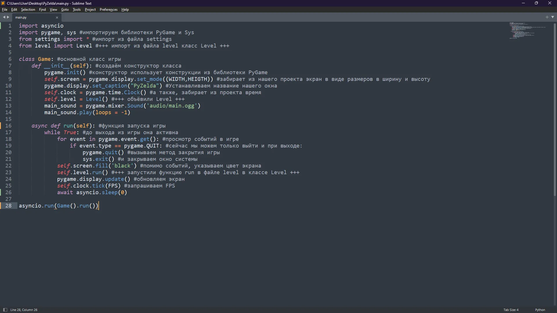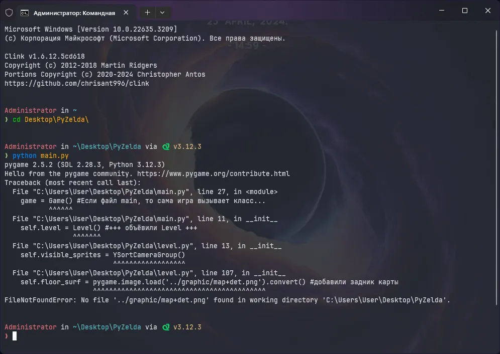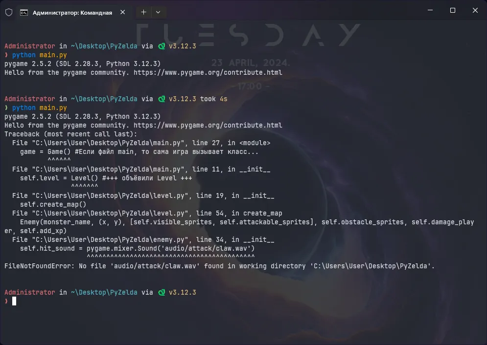 После всех исправлений, запустим main.py и всё должно работать. Теперь заменим все файлы звуков с .wav на .ogg. Не забудьте заменить расширения в коде, чтобы не получить это:
