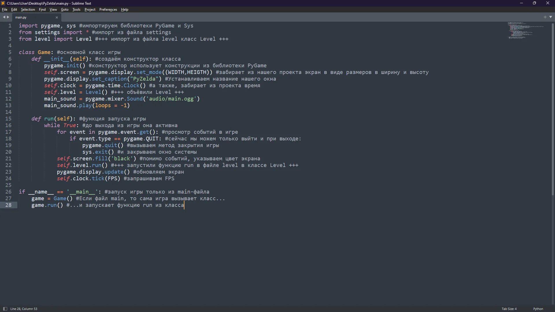 Мы просто создали класс и в нём 2 группы, а затем в классе создали метод вызова данного класса. Далее, нужно вернуться в main-файл и импортировать класс Level (from level import Level), объявить класс Level (self.level = Level()), а таже запустить его в самом run-методе в main (self.level.run()). Я решил пока убрать дебаг из проекта, так как сейчас дебажить нечего и финальный код в main-файле выглядит так:
