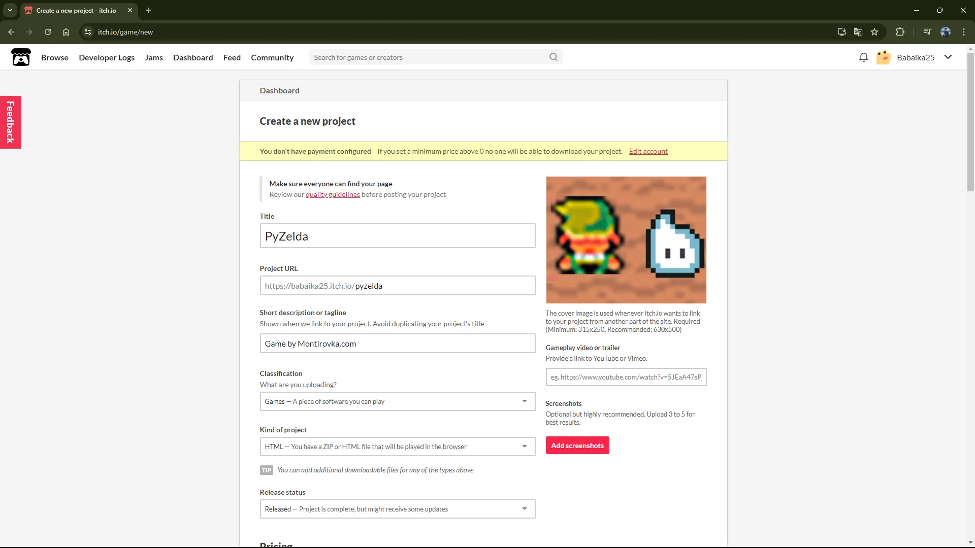 Теперь, в папке с проектом, вы обнаружите новую директорию build. Это как раз тот билд, который мы собирали из процессов. Внутри директории ещё две: web и web-cache, а также файл с версией сборщика. В папке web лежит всё для деплоя проекта. Я же решил выгрузить его на itch.io. Чтобы это делать, я создал .zip-архив папки web и выгрузил проект с такими настройками: